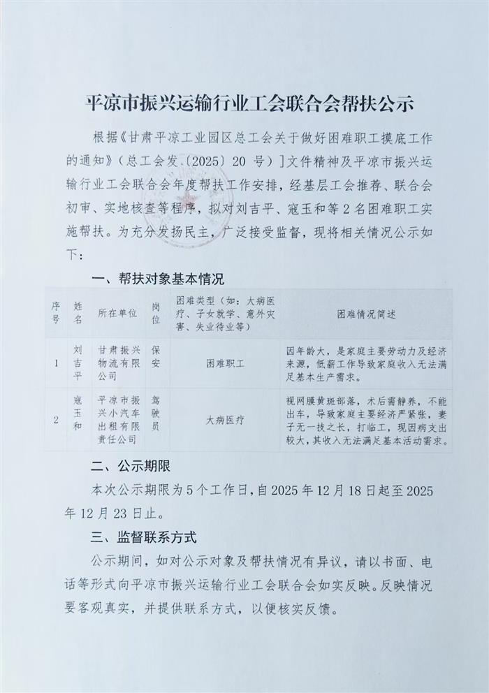 平?jīng)鍪姓衽d運(yùn)輸行業(yè)工會(huì)聯(lián)合會(huì)幫扶公示